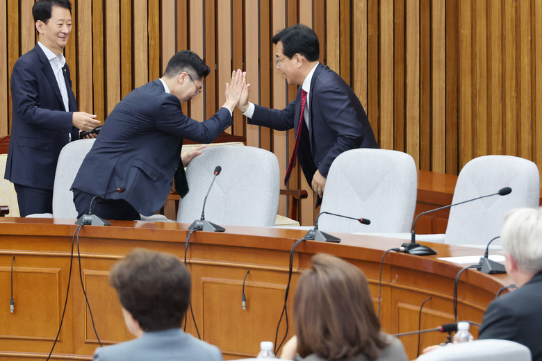 [세계타임즈 = 신상철 기자] 국민의힘 송언석 신임 원내대표가 17일 서울 여의도 국회에서 열린 초선 의원들과의 간담회에서 박준태 의원 등 참석자들과 손바닥을 부딪치며 인사하고 있다. 2025.6.17