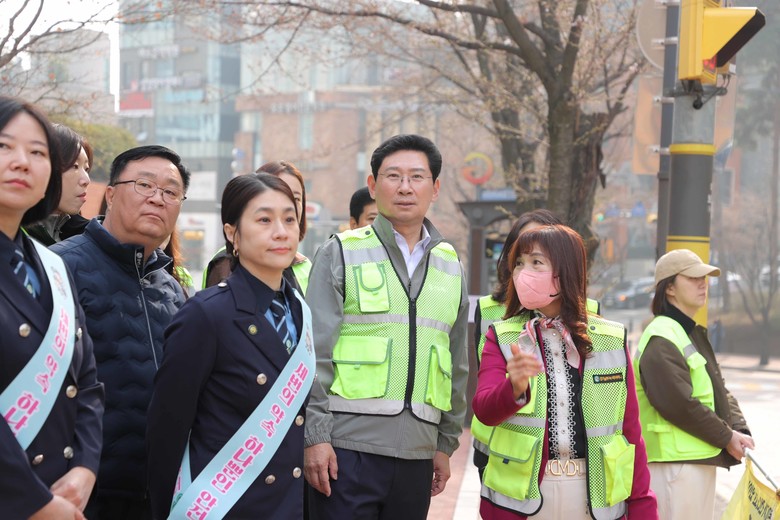 이 시장은 현장 점검 이후 한빛초 정문 횡단보도에서 어린이들의 등교 상황을 살피며 차량 통행을 정리하고 보행 안전을 지도하는 등 교통지도 봉사활동에 직접 참여했다.