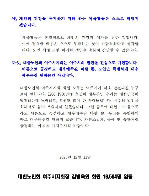 이번 조례 개정안은 65세 이상 시민과 장애인에게 공공체육시설 사용료를 전액 무료화하는 내용을 담고 있었으나, 대한노인회 여주시지회는 입장문을 통해 전면 무료화보다는 현행 감면 제도의 유지가 바람직하다는 분명한 입장을 밝혔다.