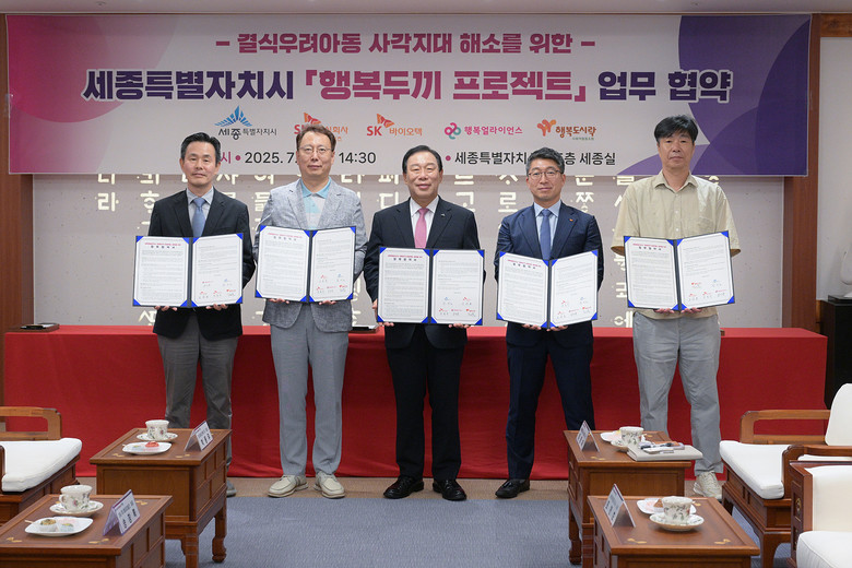 시는 7일 시청 세종실에서 SK㈜머티리얼즈, SK바이오텍㈜, 행복나래㈜, 행복도시락사회적협동조합과 ‘세종시 행복두끼 프로젝트 업무협약’을 체결했다.