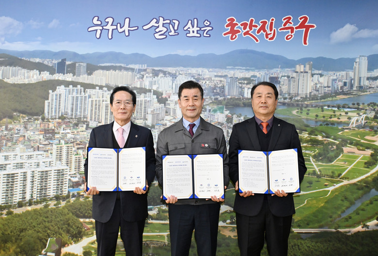 울산 중구(구청장 김영길)와 울산신용보증재단(이사장 김용길), (재)울산경제일자리진흥원(원장 김철준)은 2월 6일 오후 2시 중구청 구청장실에서 ‘2026년 소상공인·중소기업 경영안정자금 사무위탁 협약’을 체결했다.
