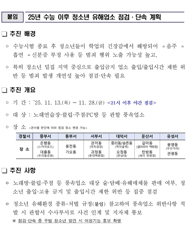 단속 시간은 매일 밤 9시 이후로, 청소년 출입이 잦은 은행동(스카이로드), 대흥동(우리들공원), 둔산 갤러리아 백화점 일대, 한남대 인근 오정동, 봉명동 우산거리 등 지역이 중점 점검 대상이다.