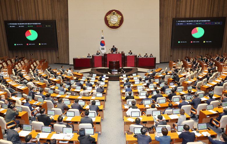 4일 국회 본회의에서 지역사랑상품권 이용 활성화에 관한 법률 일부개정법률안이 통과되고 있다. 2025.8.4