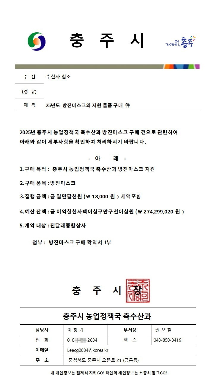 충주시청 축수산과 이청기 가축방역팀장에 따르면 지난 10월 24일 오후 5시경, 충주 시내 한 철물점에 “방진마스크를 대리 구매하겠다”는 연락이 있었으나, 실제 구매로 이어지지 않는 1차 ‘노쇼 사기’가 발생했다.