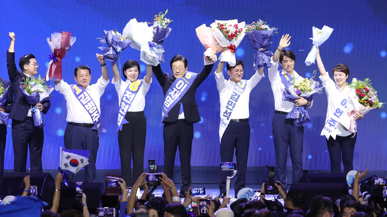 민주당 손 들어 인사하는 이재명 대표와 최고위원들
