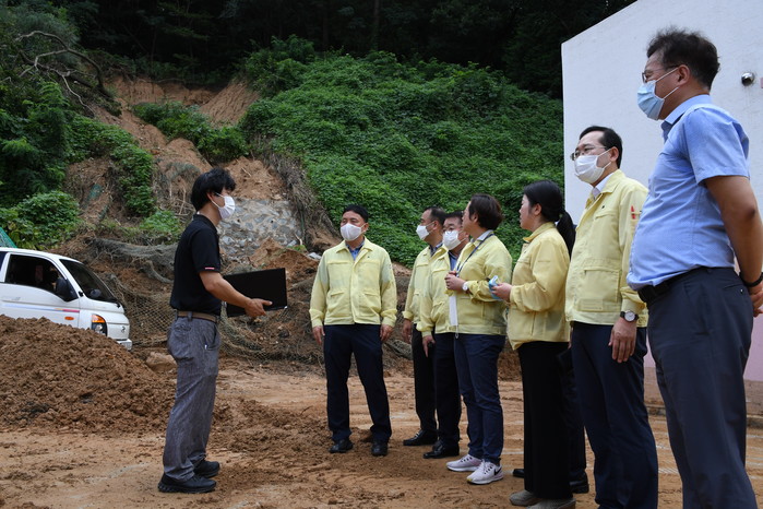 이날 동아여자중·고등학교에서 교육문화위원회 위원들은 학교장으로부터 피해 및 복구조치 현황을 청취한 이후, 폭우로 인해 사면이 유실된 급식실·체육관 주변과 교내 경사로 아스팔트 도로 균열 및 파열상태를 확인했다.