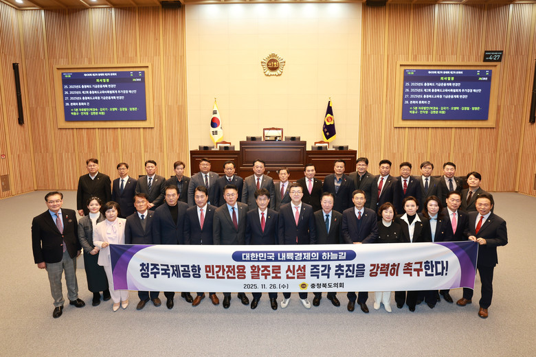 12대 후반기 의회 출범 직후 ‘청주국제공항 활성화 지원 특별위원회’를 발 빠르게 구성한 도의회는 ‘청주국제공항 민간전용 활주로 신설을 위한 사전타당성조사 용역비 및 제7차 공항개발 종합계획 반영 건의안’과 ‘청주국제공항 항공사고 대비 안전 조치 및 민간 전용 활주로 신설 촉구 건의안’을 신속히 채택하며 공항 문제에 선제적으로 대응했다.