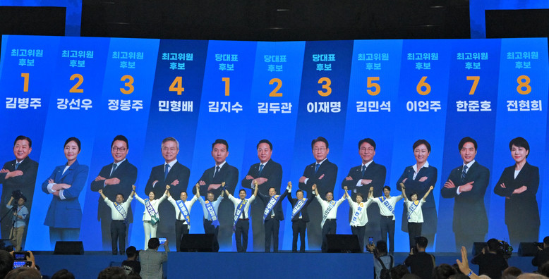 왼쪽부터 김병주·강선우·정봉주·민형배 최고위원 후보, 김지수·김두관·이재명 당대표 후보, 김민석·이언주·한준호·전현희 최고위원 후보.2024.8.18