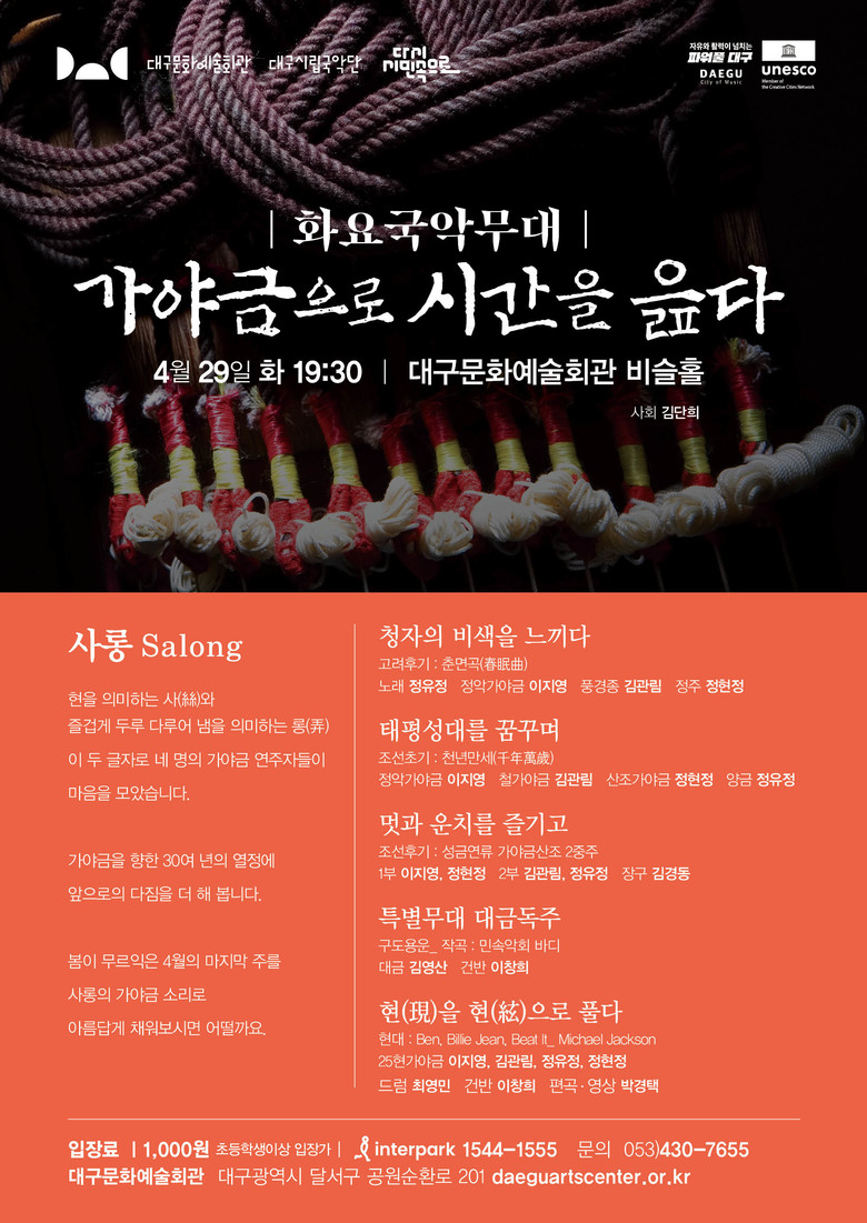 ▸ 천원으로 즐기는 전통문화예술 [세계타임즈=대구 한윤석 기자] 대구시립국악단 화요국악무대 <가야금으로 시간을 읊다> 공연이 4월 29일(화) 저녁 7시 30분 대구문화예술회관 비슬홀에서 펼쳐진다. 이번 공연은 고려 후기에서 현대까지 시대순으로 선곡하여 가야금을 중심으로 재구성한 공연이다.