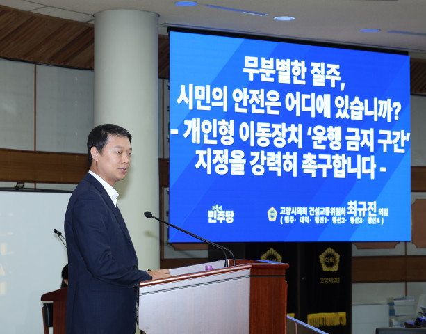 [고양시 세계타임즈=송민수 기자] 고양특례시의회 최규진 의원(행주·대덕·행신1 ‧ 2 ‧ 3 ‧ 4동)은 지난 13일 고양특례시의회 본회의장에서 개최된 제299회 제2차 정례회 제2차 본회의 시정질의에서 시민 안전을 위해 무분별하게 질주하는 개인형 이동장치 운행 금지 구간 지정을 강력히 촉구했다.