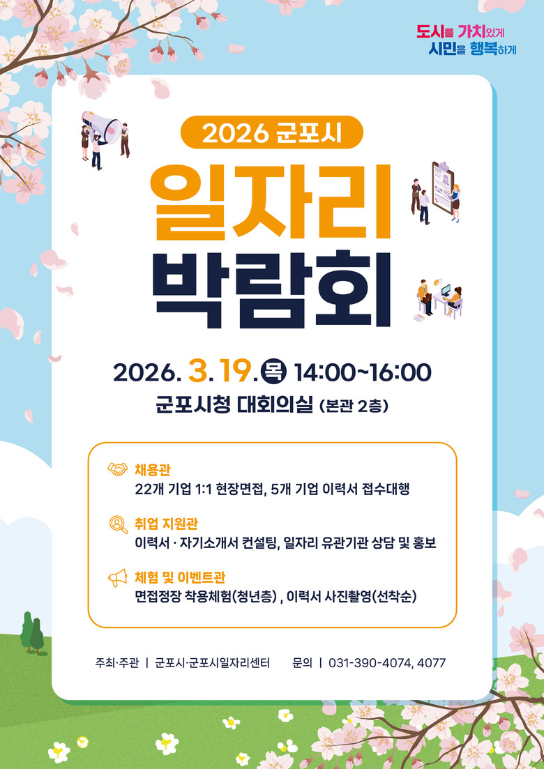 박람회 참여 기업 및 채용 직무 등 자세한 사항은 시 홈페이지 ‘새소식란’에서 확인할 수 있으다. 추가 문의는 군포시일자리센터(031-390-4074)로 하면 된다.