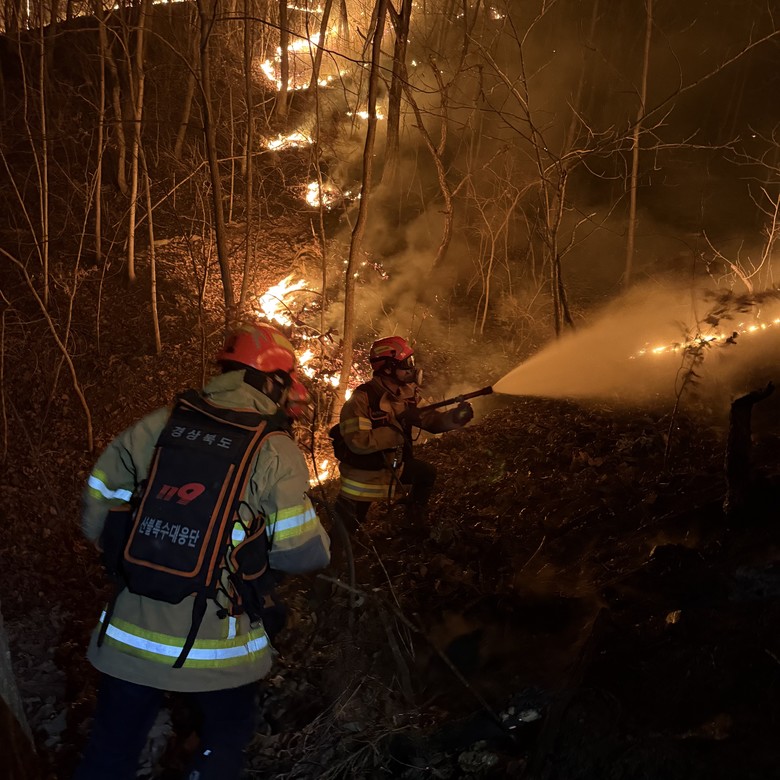이후에는 재발화가 발생한 지역에 다시 투입되어 열악한 기상 조건 속에서도 밤낮없이 진압 활동을 이어갔다. 그중에서도 특히 안동시 남후면 무릉리 일대의 험준한 산악 지형과 접근이 어려운 외곽 지역에서도 지속적인 감시와 진화 작업을 반복하며 화재의 완전한 종식을 위해 총력을 다한 끝에, 의성·안동·청송 각지의 잔불 정리 작업까지 마무리한 뒤에야 비로소 대응단은 모든 현장 활동을 종료할 수 있었다.