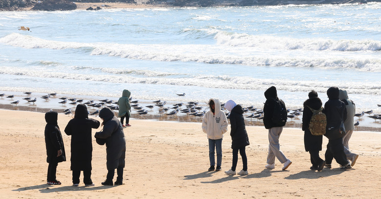 [인천 세계타임즈 = 심하린 기자] 추위가 이어진 23일 인천 중구 을왕리해수욕장을 찾은 시민들이 찬바람 속에서 해변을 걷고 있다. 2025.2.23
