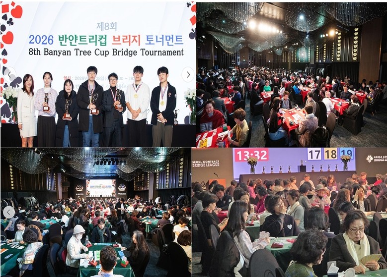 (상단좌측: (사진 좌측부터) 김혜영 회장, 조문주ㆍ한벼리 연양초 교사, 김경민 전무, 김경용 회장, 신시율ㆍ이정찬 학생 시상 장면, 상단우측: 제8회 반얀컵 브리지 토너먼트’의 경기 현장 모습, 하단좌측: 제8회 반얀컵 브리지 토너먼트’의 경기 현장 모습2, 하단우측: 뜨거운 경기 현장 모습)