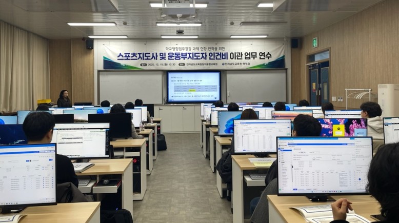 전라남도교육청은 15일 전남교육청창의융합교육원에서 22개 시군 교육지원청 체육복지팀 인건비 업무 담당자를 대상으로 ‘스포츠지도사 및 운동부지도자 인건비 이관 업무 연수’를 실시했다.