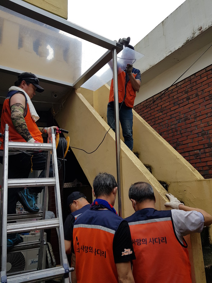 천정훈 집수리봉사단장은 “오늘 천막교체 봉사로 장마철에 빗물누수로 고생하는 아이들이 편하게 생활할 수 있게 되어서 행복과 보람을 느낀다.”고 말했다.