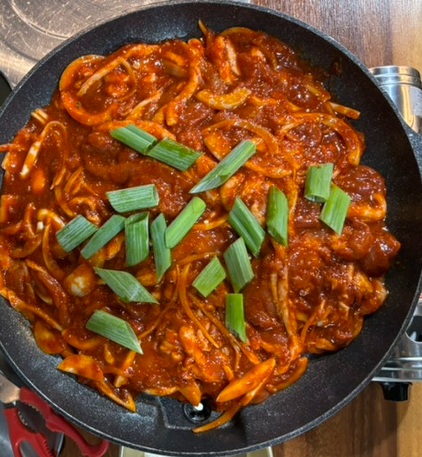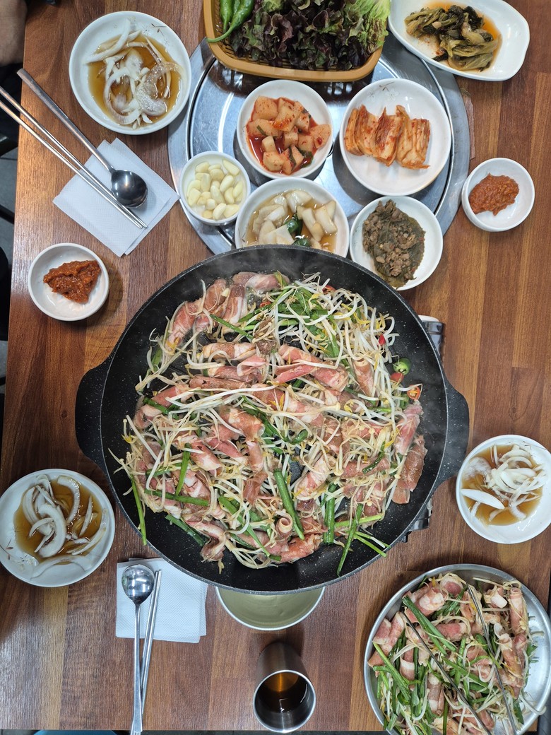 달군 프라이 펜에 바로 생고기를 넣고 볶아주면 아래쪽이 살짝 그을러 익어 숯불향 맛 나는 그 위에 양념을 넣고 팍팍 섞어 2분 정도 잘 볶아주면 고기색과 양념색이 조화를 이루며 잘 있어 먹기 좋은 오리불고기‘라서 미식가들이 즐겨 찾는 메뉴인 것 같다.
