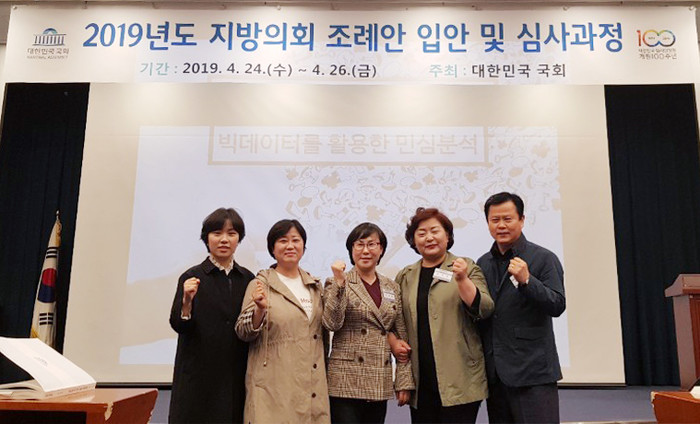 [울산=세계타임즈 이호근 기자] 울산시의회 전영희 환경복지위원장을 비롯한 천기옥 교육위원장, 김미형 의원, 김시현 의원, 박병석 의원은 4월 24일에서 26일까지 3일간 국회 헌정기념관에서 국회사무처 의정연수원에서 주관한 “2019년도 지방의회 조례안 입안 및 심사과정” 교육을 수료하였다.