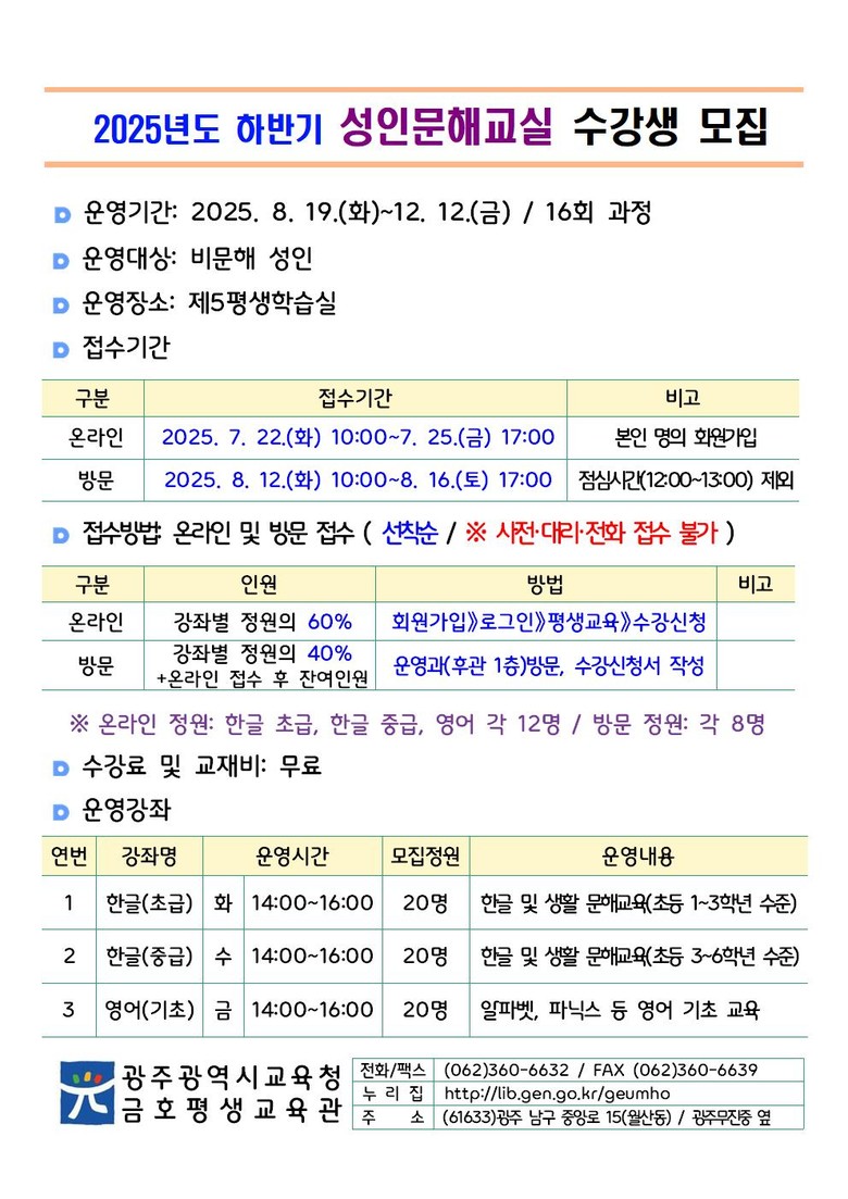 수강 신청은 오는 22~25일에는 금호평생교육관 누리집(https://lib.gen.go.kr/geumho)을 통해 온라인 접수할 수 있으며, 8월 12~16일에는 운영과로 방문 접수하면 된다.