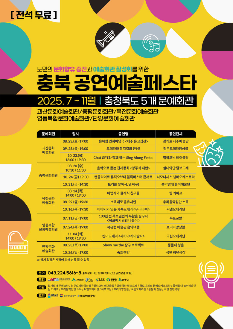 이후에도 8월부터 11월까지 충북공연예술페스타 전통예술진흥재단의 우수한 공연과 도내 공연단체들의 공연이 5개 지역의 문화예술회관에서 지속된다.