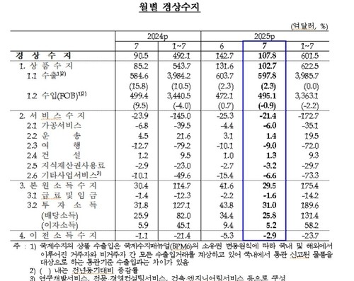 7월 경상수지 107.8억달러…반도체 등 수출호조에 7월기준 최대