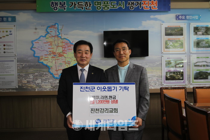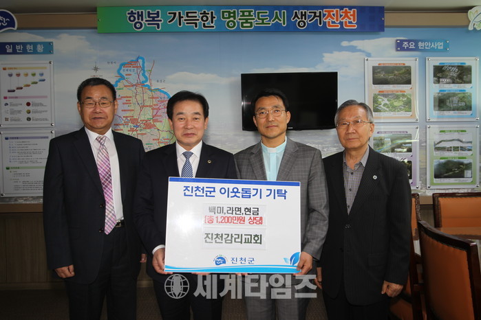 [진천=세계타임즈 이현진 기자] 진천감리교회(담임목사 이찬우)에서는 21일 진천군청을 찾아 어려운 이웃을 위해 사용해달라며 1천2백만원 상당의 성금 및 물품을 전달했다.