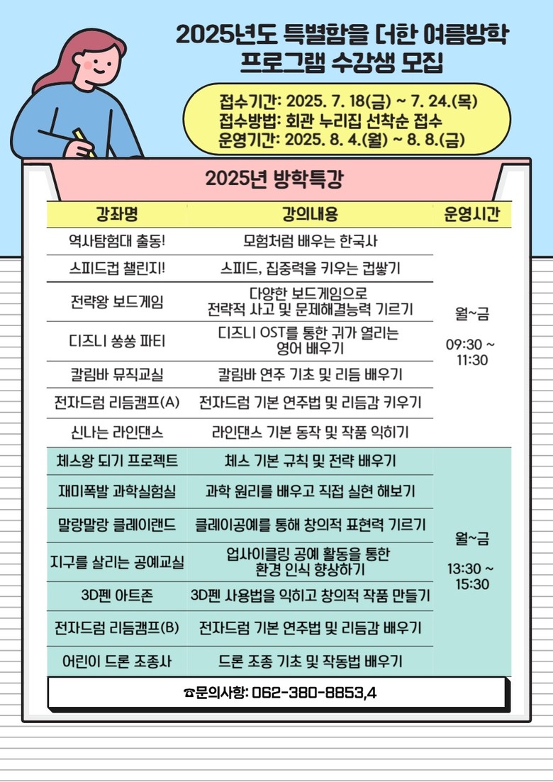 이 기간 ▲역사탐험대 출동(한국사) ▲전자드럼 리듬캠프 ▲3D펜 아트존 ▲디즈니 쏭쏭파티 ▲드론 조종사 ▲업사이클링 공예교실 등 등 체험 중심 창의·예술·과학 분야 14개 강좌가 개설돼 하루 2시간씩 운영된다.