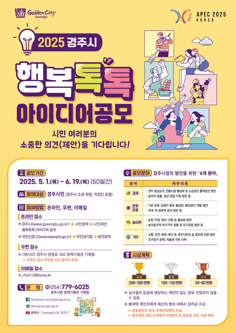이번 공모는 5월 1일부터 시작돼 오는 6월 19일까지 50일간 진행되며, 경주시 홈페이지 ‘행복톡톡 아이디어’ 게시판, 국민신문고 ‘국민생각함’, 우편, 이메일 등을 통해 누구나 참여할 수 있다.