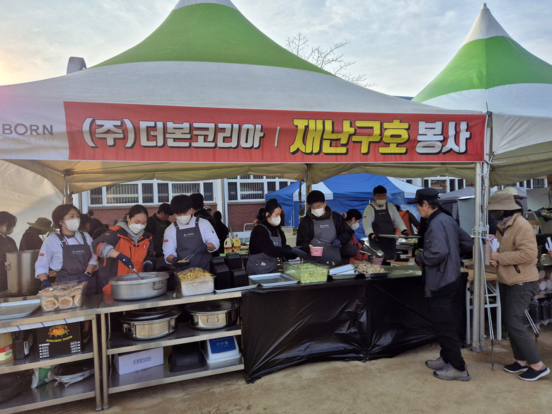 ㈜더본코리아는 이재민뿐만 아니라 산불 진화 작업에 투입된 군.경 및 소방 인력 등에 매 끼 300인분 이상의 식사를 현장에서 조리해 제공하고 있으며, 산불 진화 작업으로 무료 급식소를 방문할 수 없는 인력에는 직접 배달도 마다하지 않으며 온정의 손길을 보태고 있다.
