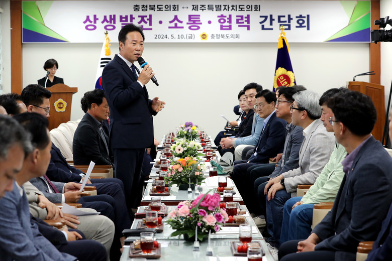 [충북 세계타임즈=이현진 기자] 충북도의회(의장 황영호)는 5월 10일 도의회를 방문한 제주특별자치도의회(의장 김경학)와 상호 교류 증진 및 상생발전을 위한 간담회를 가졌다.