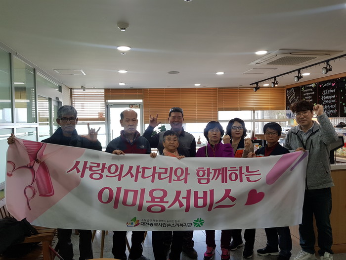 [세계타임즈 이장성 기자] 7천명 SNS 대전시 봉사단체 사랑의 사다리 밴드(리더 이정제)는 12일 오전10시, 대전시립손소리복지관(관장 유형걸) 4층에서 농아인들에게 미용봉사로 우리 사회의 따뜻한 사랑을 전달하였다.