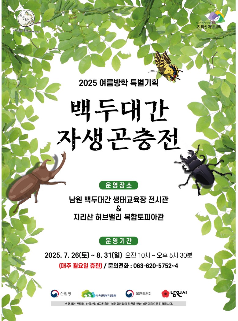 산림청 등의 후원을 받아 녹색자금으로 운영되는 이번 특별기획전은 백두대간 생태계의 근간이 되는 다양한 곤충을 주제로 한 기획전으로 50여 종 1,000여 마리의 백두대간 속 곤충과 곤충을 닮은 다양한 절지동물을 만날 수 있으며 ‘백두대간 생태교육장’과 ‘지리산 허브밸리’에서 함께 운영한다.