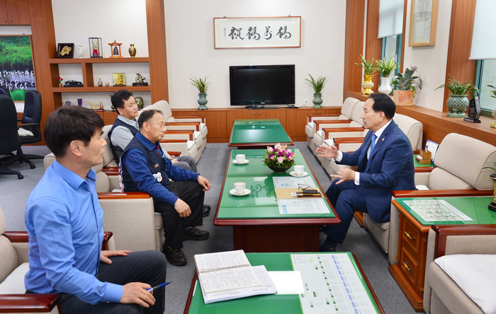 [울산=세계타임즈 이호근 기자] 울산시의회 황세영 의장은 29일 오후, 의장실에서 전국금속노조 현대중공업지부 박근태 지부장과 문태규 정책기획부장을 만나 현대중공업 새 합작법인 본사 이전 문제 등에 대해 논의했다.