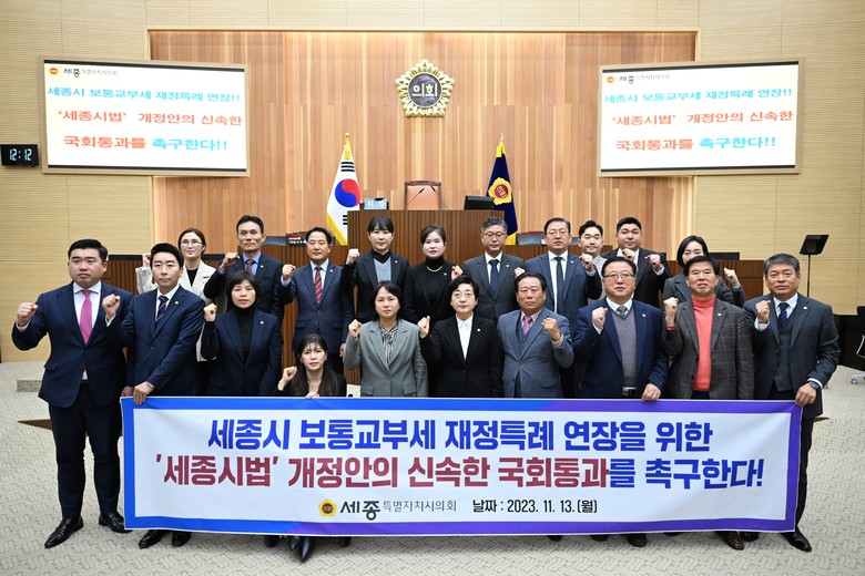 세종시의회 의원 전원은 이날 공동 발의한 건의안에서 국회에 계류 중인 보통교부세 재정 특례 기간을 2030년까지 연장하는「세종시법」일부개정안의 신속한 통과를 촉구했다.