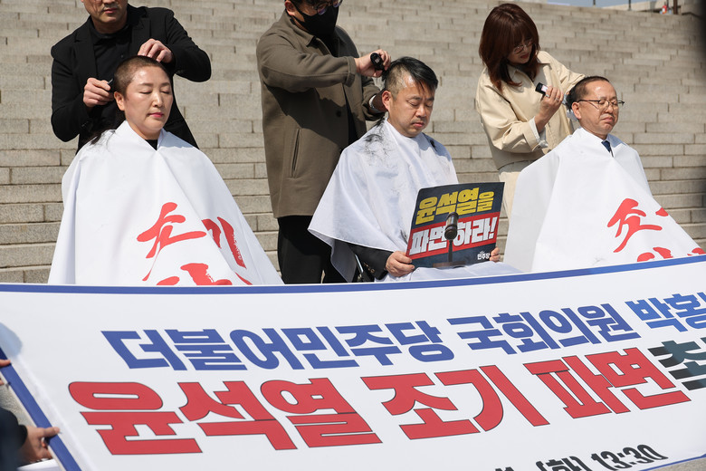 민주당 김문수·박홍배·전진숙 의원은 국회에서 삭발식을 하고 윤 대통령 파면을 촉구했다.
