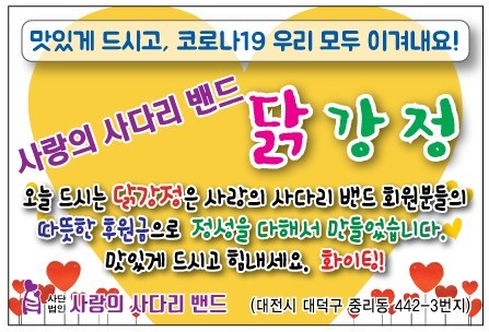 대전시지체장애인협회 동구지회 김연숙 회장은 “오늘 사랑의 사다리 밴드 봉사단체에서 맛있는 닭강정을 지원해 주어서 큰 힘과 위안이 된다.”면서 감사함을 전했다.