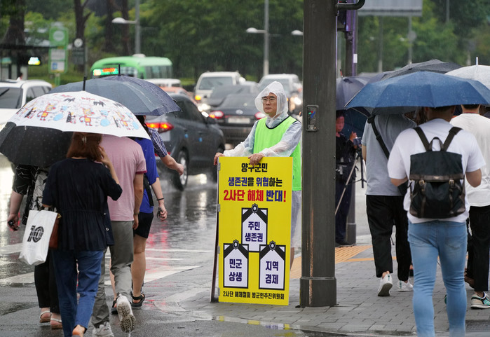 [양구군=세계타임즈 김민석 기자] 신철우의원이 31일 서울 용산 국방부 정문에서 2사단 해체반대 1인시위를 하고있다.