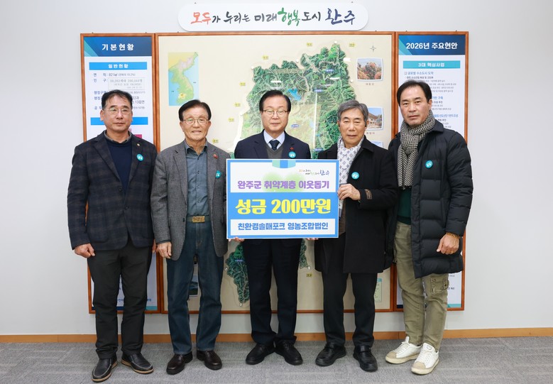 유희태 완주군수는 “경기 침체로 어려운 시기임에도 불구하고 2012년부터 한결같이 이웃사랑을 실천해 주시는 친환경솔매포크 영농조합법인에 깊은 감사를 드린다”며 “기탁해 주신 소중한 성금은 관내 저소득층 및 취약계층을 위해 투명하고 의미 있게 사용하겠다”고 화답했다.
