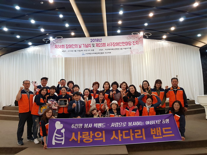 약 천여명의 서구장애인들이 참석한 기념행사에서 사랑의 사다리 밴드 회원 40명은 주차안내, 행사장 정리 및 안내 등을 하면서 원활한 행사 진행 봉사를 하였다.