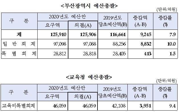 예결특위에서 의결한 부산시 예산안은 시에서 요구한 12조 5,910억 보다 4억원 감액된 12조 5,906억원으로 전년 대비 7.9% 늘어났으며, 교육청 예산안은 4조 6,059억원으로 전년 대비 9.4% 늘어난 금액이다.