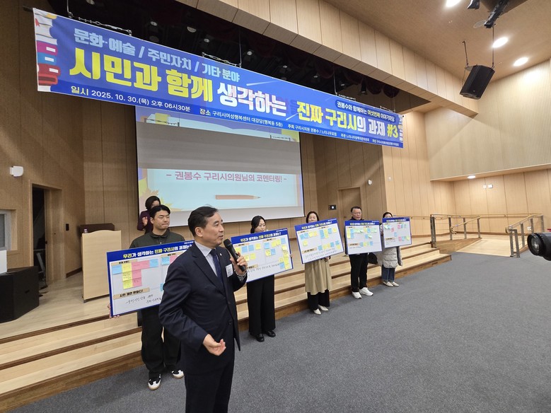 ‘정책 퍼실리테이션 회의’를 통해 시민들이 직접 생각하고 공유한 제안들에 대해 권봉수 구리시의원은 현직 구리시의회 의원으로서, 그리고 내년 지방선거 구리시장 출마예정자로서 시민들에게 답변드릴 수 있는 자리를 만들기 위해 이번 이야기마당 행사의 강연자로서 나섰다고 밝혔다.