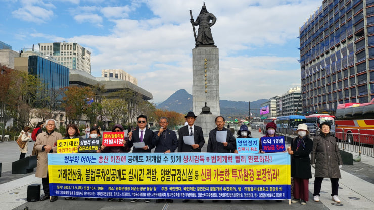 | ▲11월 9일 오전 10시 30분쯤 광화문광장 이순신 장군 동상 앞에서 ‘개혁연대민생행동’ 등 13개 시민단체 회원들이 공매도 법제 개선개혁 조기완료 등을 촉구하는 기자회견을 열고 있다. |