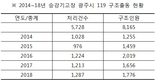 광주시소방본부 자료기준 최근 5년간 승강기 고장으로 인한 119구조출동은 5728건이고 구조인원은 8165명으로 하루 평균 3.1건, 연평균 천 건이 넘는 출동과 구조인원은 하루 4.4명, 연평균 1633명에 달하고 있다.