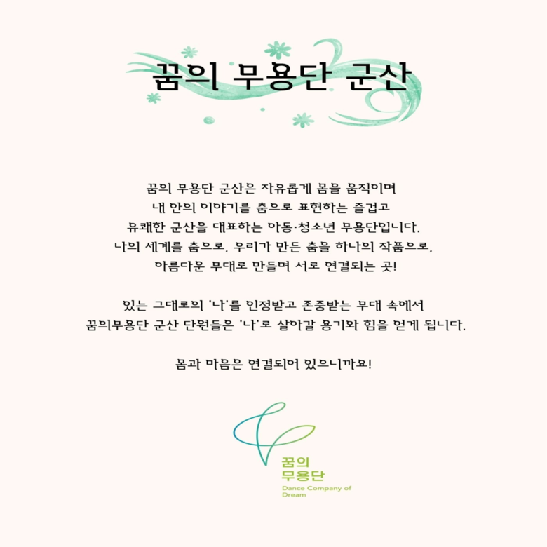 ‘꿈의 무용단 군산’은 군산시민예술촌이 운영하는 지역 기반 문화예술교육 프로그램으로, 아동·청소년이 스스로 움직임을 창작하고 공연 경험을 통해 성장할 수 있도록 마련된 사업이다.