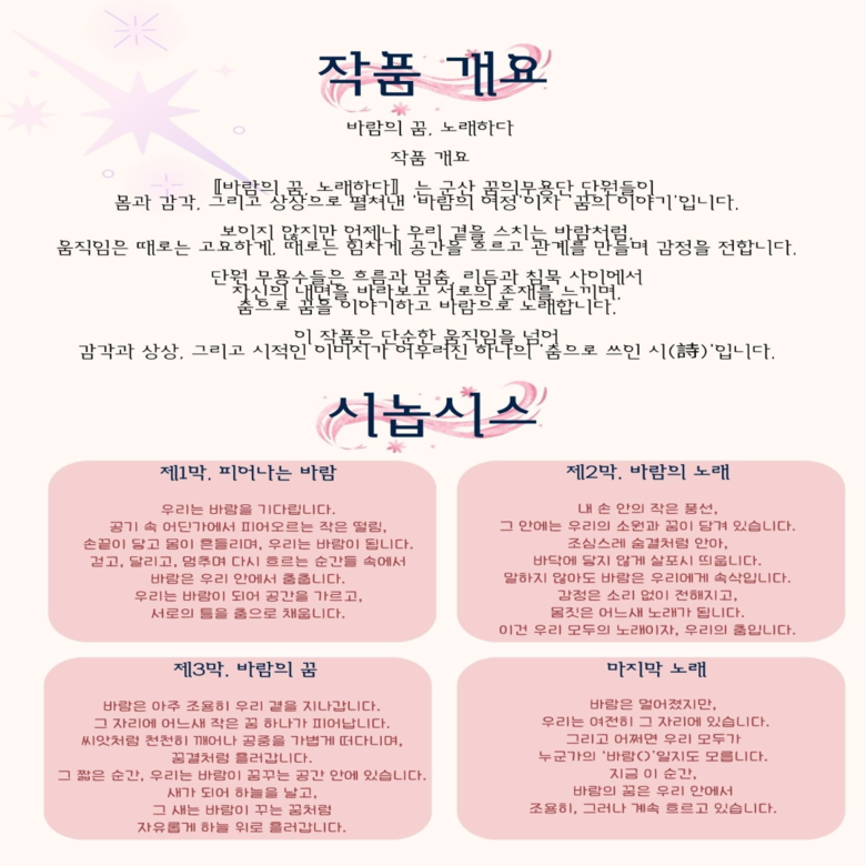 공연은 ▲바람의 시작을 담은 ‘피어나는 바람’, ▲몸짓을 통해 감정을 노래하는 ‘바람의 노래’, ▲꿈을 향해 나아가는 여정을 형상화한 ‘바람의 꿈’, ▲희망을 전하는 ‘마지막 노래’ 등으로 이루어지며, 단원들의 감정과 경험을 춤의 언어로 풀어낼 예정이다.