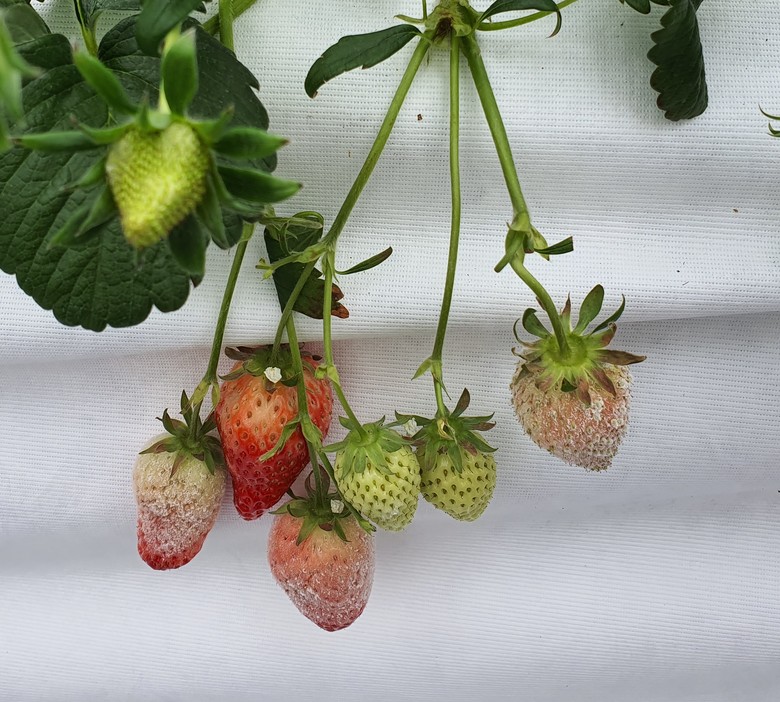 흰가루병은 잎, 줄기, 꽃, 과실 등 전반에 발생할 수 있으며, 과실에 감염되면 표면에 흰 곰팡이가 형성돼 상품성이 크게 떨어진다. 발생 최적온도는 20℃이며, 큰 일교차와 높은 습도에서 병 발생이 더욱 심화한다.