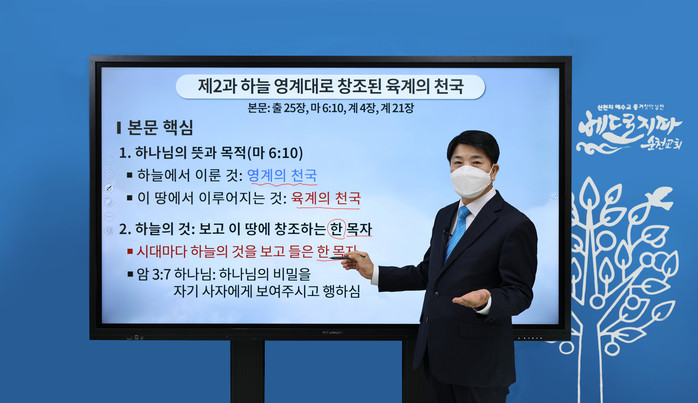 (7일 이동수 담임강사가_시온기독교선교센터 중등 과정 ‘구약신약 장별 계시 증거’ 세미나 제2과 ‘하늘 영계대로 창조된 육계의 천국'에 대해 설교하고 있는 모습)