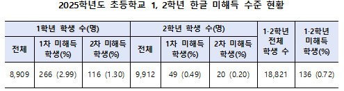 [대전 세계타임즈=이채봉 기자] 대전광역시교육청은 지난해 9월과 12월, 관내 모든 초등학교에서 실시한 한글 해득 수준 진단 검사 결과를 바탕으로 ‘2025학년도 초등학교 1, 2학년 한글 해득 수준 현황’ 분석 결과를 발표했다. 이번 조사는 한글 또박또박 프로그램(https://ihangeul.kr)을 검사 도구로 활용하여 정밀하게 진행되었다.
