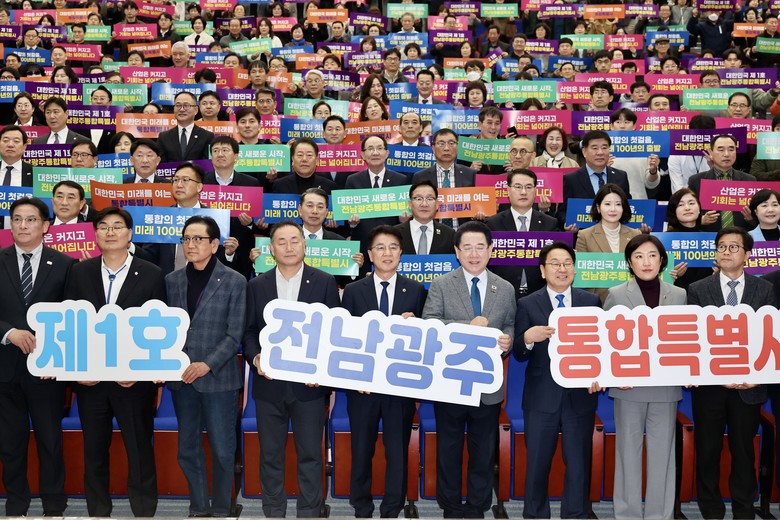 이날 행사에는 전남도의장, 전남도지사, 광주시장, 국회의원, 광주시 부의장 등 주요 인사와 시도민 500여 명이 참석해 전남·광주 행정통합의 역사적 의미를 함께 나눴다.