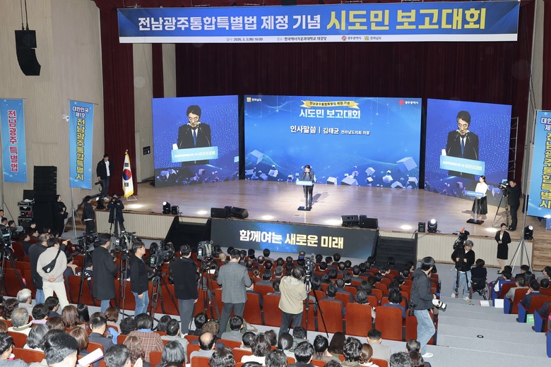 [전남 세계타임즈=우덕현 기자] 「전남광주통합특별시 설치를 위한 특별법」이 지난 3월 1일 국회 본회의를 통과함에 따라, 이를 기념하고 향후 비전을 공유하는 시도민 보고대회가 3일 한국에너지공과대학교 대강당에서 개최됐다.